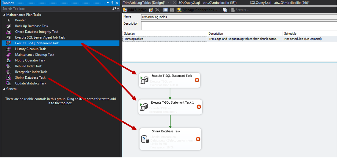 - From Toolbox, drag Execute T-SQL Stement Task twice to Designer and Shrink Database Task once. Optionally, you can separate the tasks schedules by creating subplans for each task.