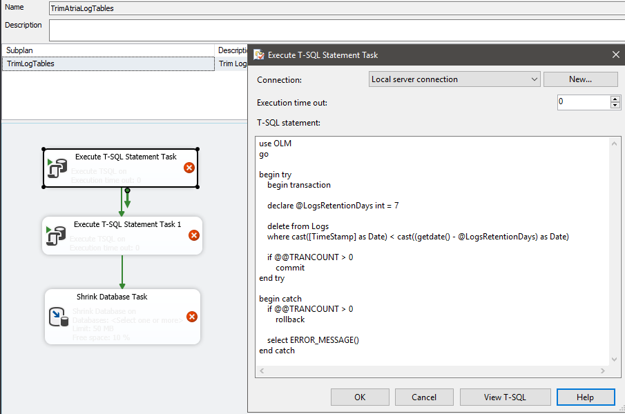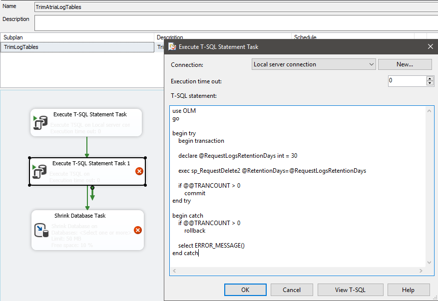 - Double click the next Execute T-SQL Stement Task and paste the SQL script. Replace the value of @RequestLogsRetentionDays in the script which is currently set to 30 days.