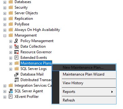 - Right click Maintenance Plans and select New Maintenance Plan…