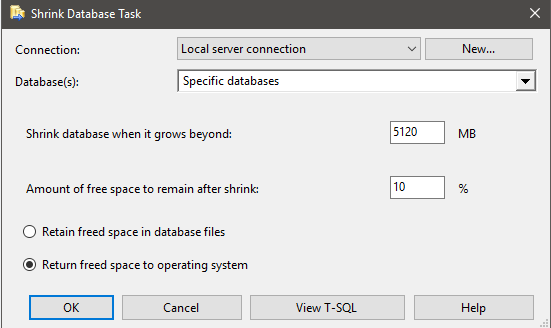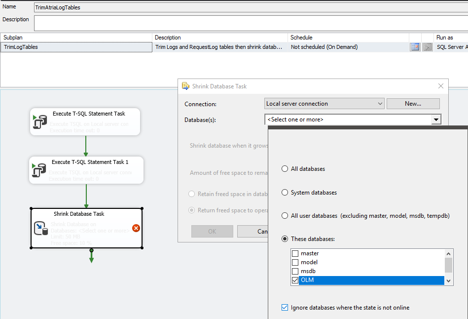 - Finally, double click Shrink Database Task and specify OLM database. Optionally, you can set to ignore offline databases.