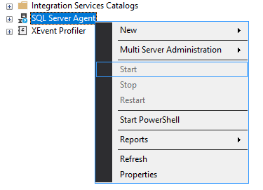 - Start SQL Server Agent if not started by right clicking SQL Server Agent and click Start.